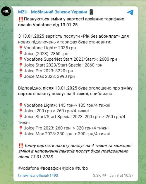 Стільниковий зв'язок в УкраїніУкраїнців попередили про суттєве підвищення тарифних планів мобільних операторів Vodafone і Київстар.Як передає "Хвиля", про це повідомляє MZU.Завтра в мережі Vodafone подорожчають окремі тарифні плани. Абонентам доведеться платити на 40-60 гривень більше, ніж раніше. Зміни пов’язані зі збільшенням ціни для нових підключень на абонемент.Зокрема, вартість послуги "Рік без абонплат" для нових підключень у тарифах становитиме:Vodafone Light+: 2035 гривеньJoice (2023): 2860 гривеньVodafone SuperNet Start 2023/Start+: 2600 гривеньJoice Start 2023/Start Special: 2860 гривеньJoice Pro 2023: 3220 гривеньJoice Max 2023 року: 3990 гривеньТакож оголошено про зміну вартості пакета послуг на 4 тижні, приблизно:Vodafone Light+: 145 – 185 гривень на 4 тижні;Joice: 200 – 260 гривень на 4 тижні;Joice Start / Start Special 2023: 200 – 260 гривень на 4 тижні;Joice Pro 2023: 260 – 320 гривень на 4 тижні;Joice Max 2023: 330 – 390 гривень на 4 тижні.