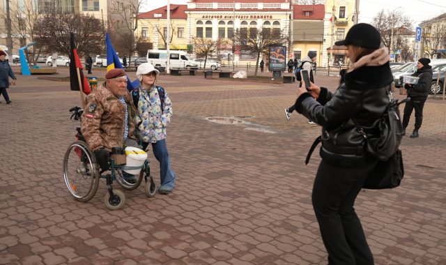 В середмісті Хмельницького до волонтера Григорія Янченка, відомого в соцмережах як дядя Гріша, підходять поспілкуватись, сфотографуватись та задонатити на армію місцеві жителі.