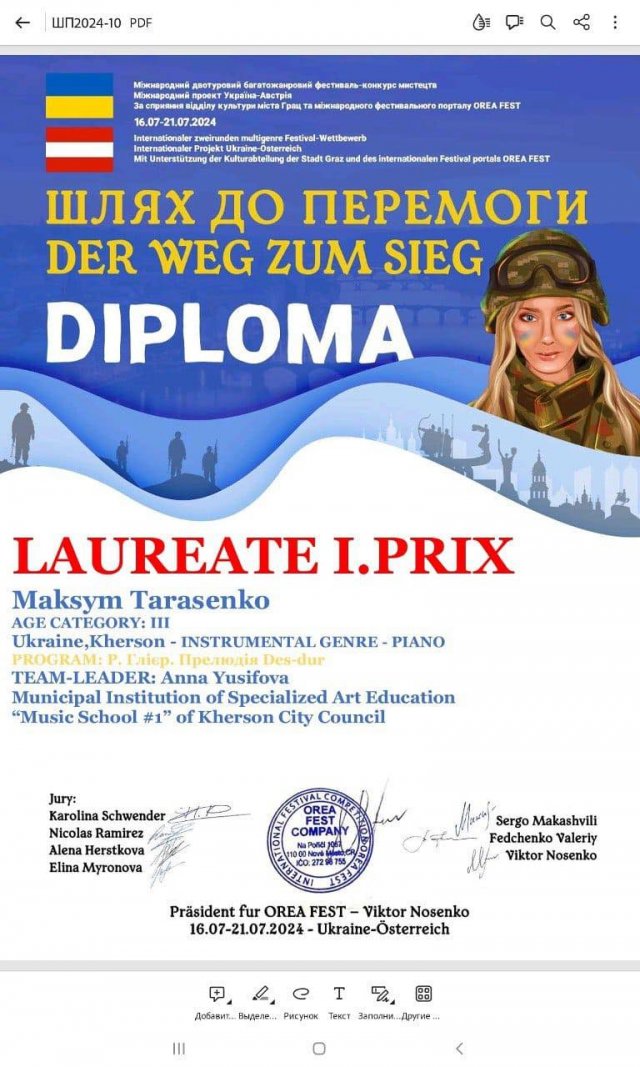 Учень фортепіанного відділу музичної школи №1 Херсонської міської ради Максим Тарасенко став переможцем Міжнародного багатожанрового двотурового фестивалю-конкурсу мистецтв "ШЛЯХ ДО ПЕРЕМОГИ".