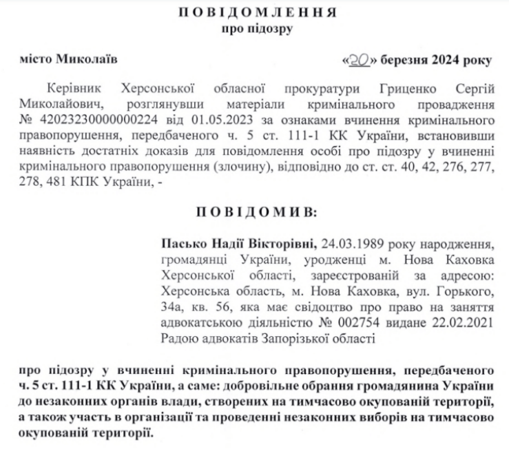 34-річна адвокатка Надія Пасько з Нової Каховки на Херсонщині 20 березня отримала від Херсонської обласної прокуратури підозру в колабораційній діяльності.Хто повідомляє: Європростір.Слідчі встановили, що Надія Пасько, будучи адвокаткою Адвокатури України, добровільно перейшла на бік ворога і очолила так зване Херсонське регіональне відділення російської партії ЛДПР.18 червня 2023 року Пасько незаконно зареєструвала це відділення в окупаційному реєстрі юридичних осіб.