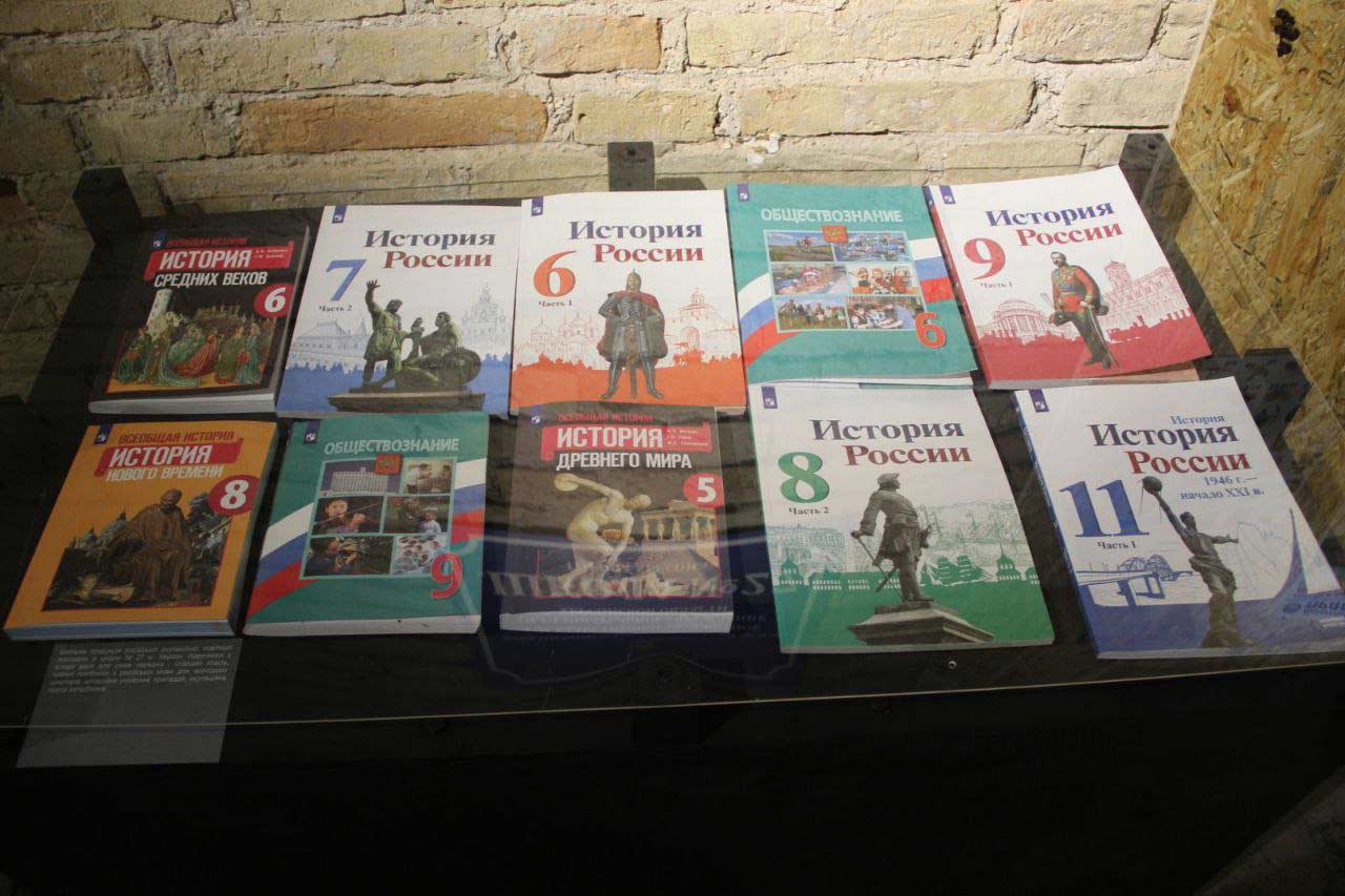 Російські підручники з Херсона на виставці «Обережно! Руzzкій мір». Фото: Національний музей історії України в Другій світовій війні / Facebook