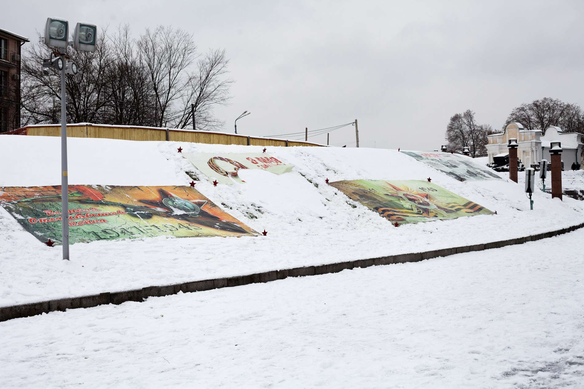 Частину цих зразків російської пропаганди одразу оформили у виставку «Херсон."Русскій мір". 9 днів. Vідспівування», яка розташувалася просто неба – біля підніжжя скульптури «Батьківщина-мати».