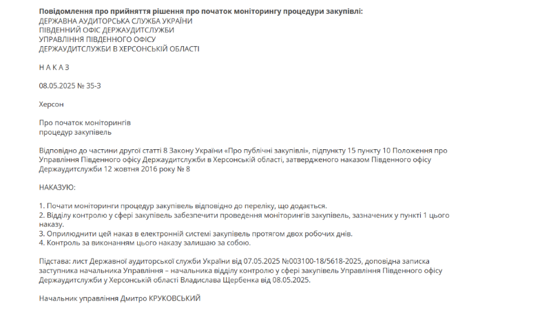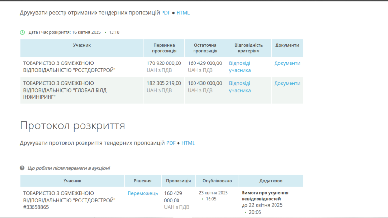 6 травня 2025 року між товариством "Ростдорстрой" та державною установою уклали договір на виконання робіт. Однак вже 8 травня Південний офіс Державної аудиторської служби оголосив про початок моніторингу цієї закупівлі через ознаки порушень законодавства у сфері публічних закупівель, виявлені під час аналізу даних Prozorro.