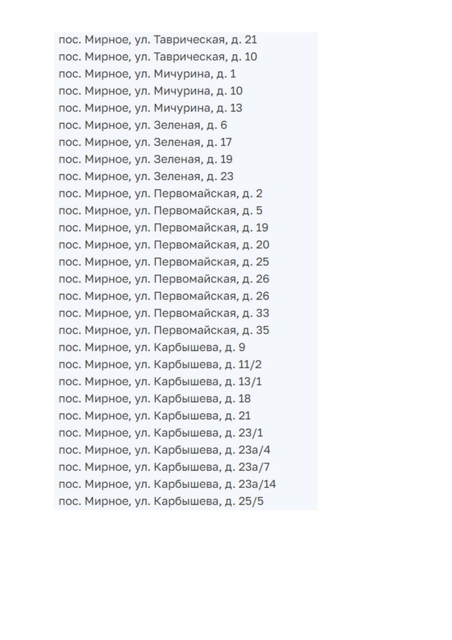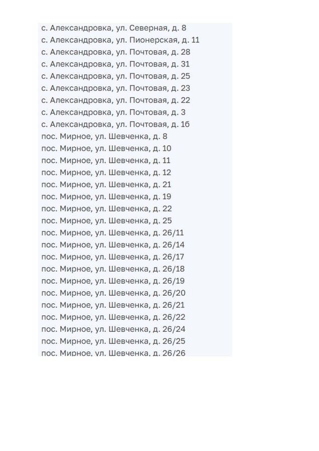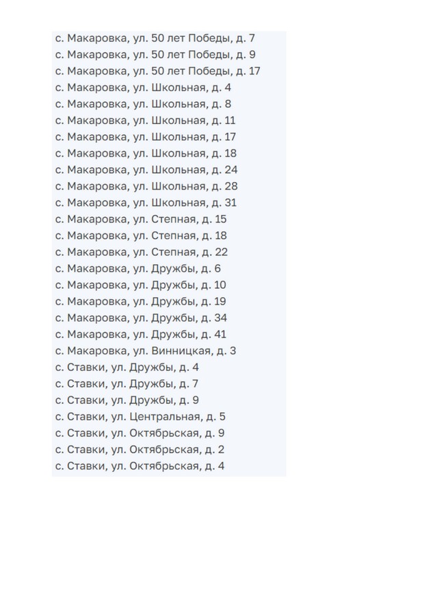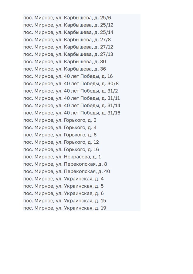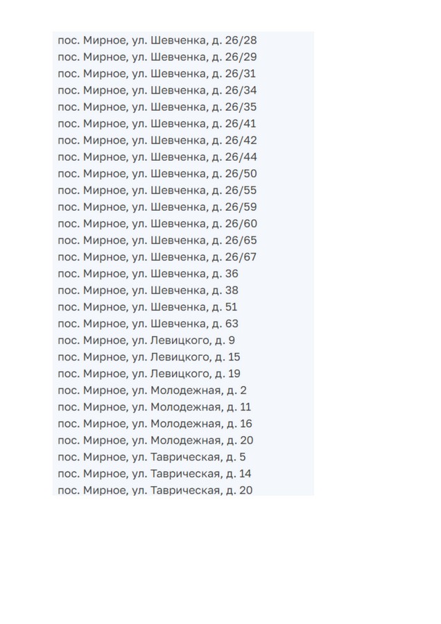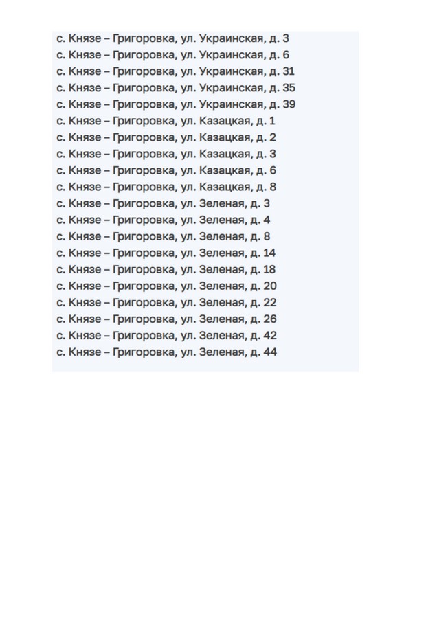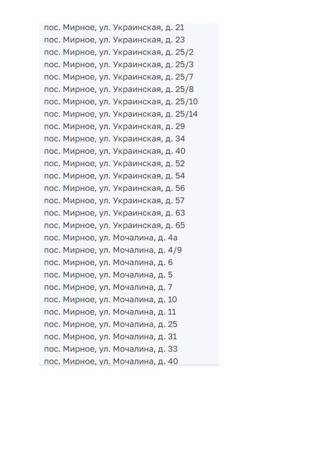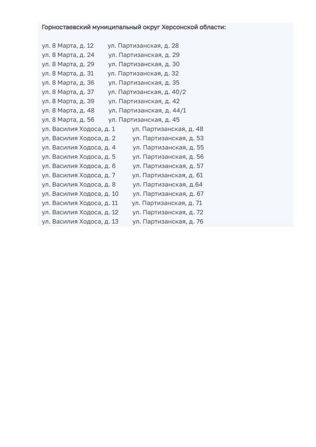 У списку вказані 324 адреси у Горностаївській селищній громаді Каховського району. Окупанти вказали лише назви вулиць і номери будинків, без назв населених пунктів. Вочевидь, значна частина цих адрес стосується самої Горностаївки.