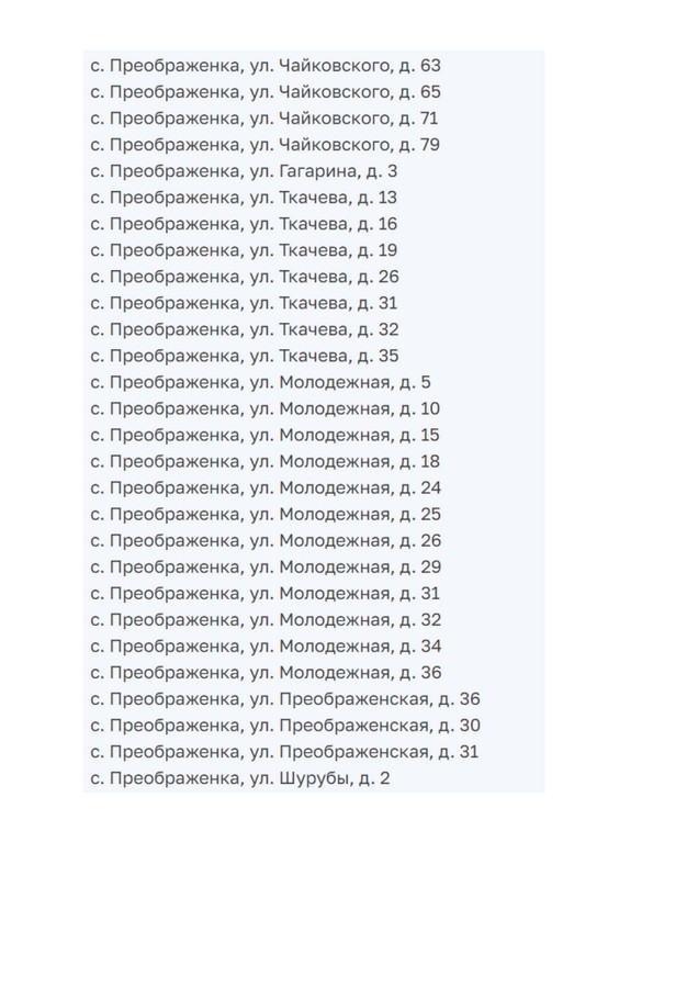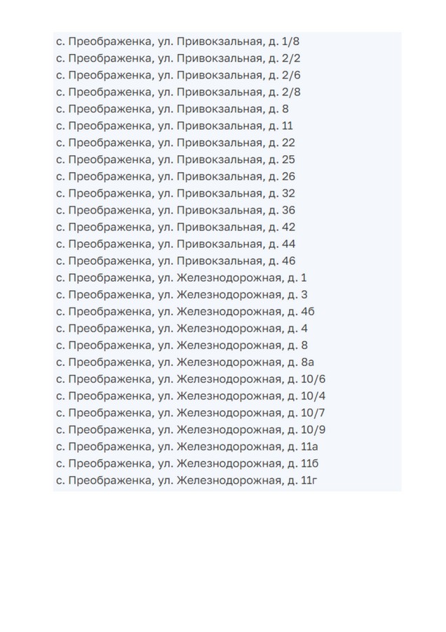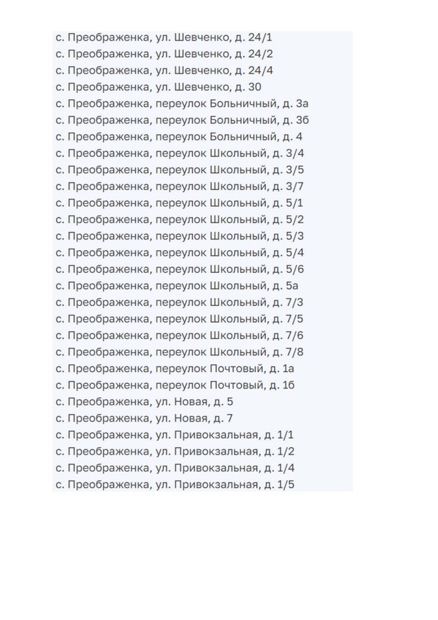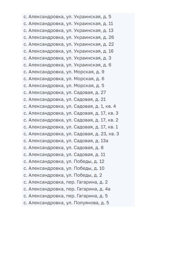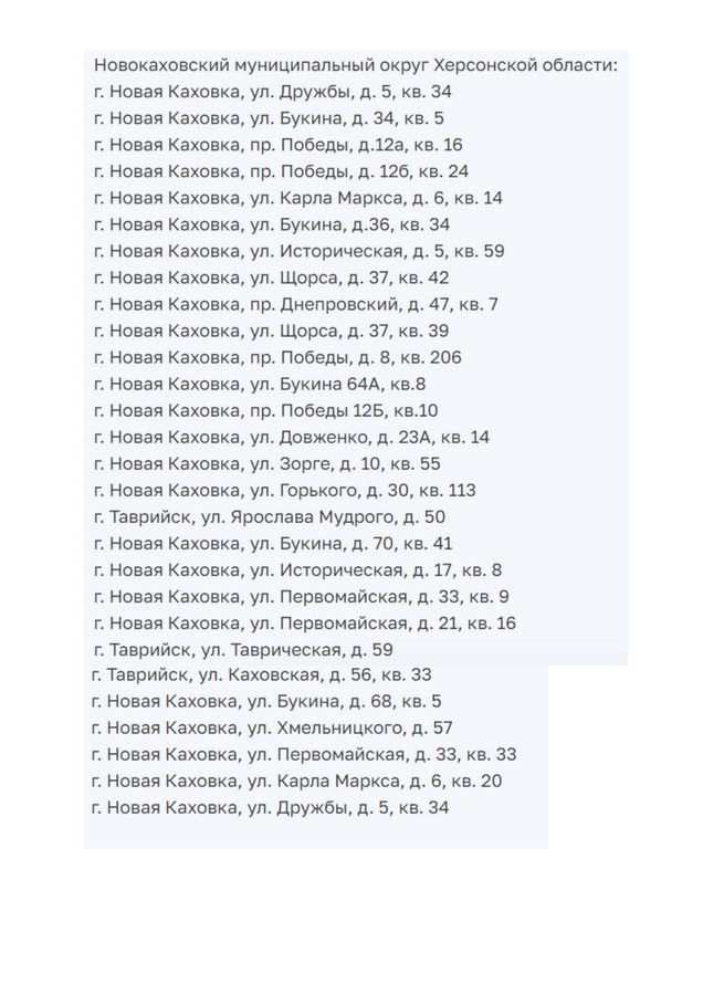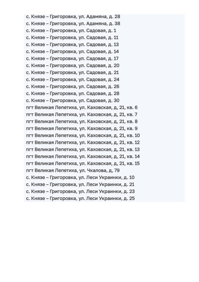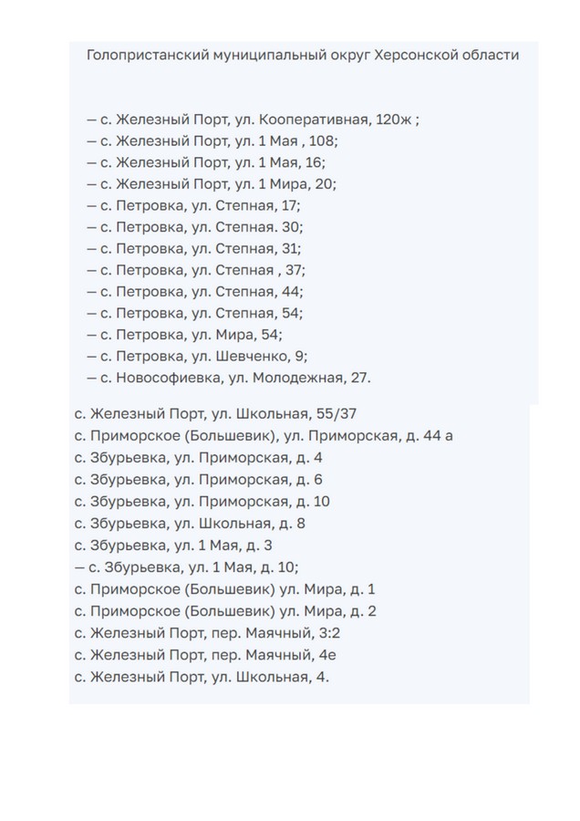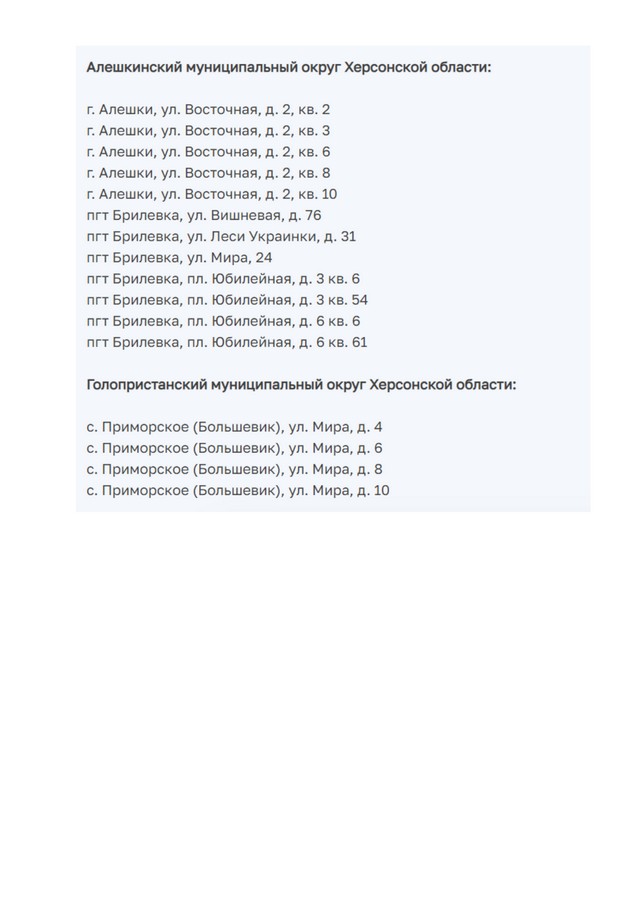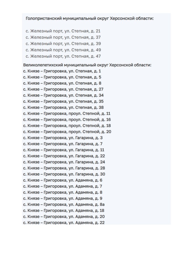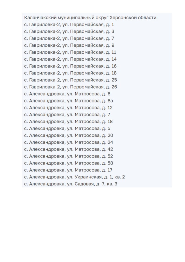 12 адрес вказано в селі Гаврилівка Друга Каланчацької громади Скадовського району, 13 – у селі Залізний Порт, 28 – у селі Макарівка Мирненської громади, 78 – у с. Олександрівка, 159 – у селищі Мирне, 161 – у селі Преображенка, 25 – у Новій Каховці, 63 – у Князе-Григорівці, 10 – у селищі Велика Лепетиха Каховського району.
