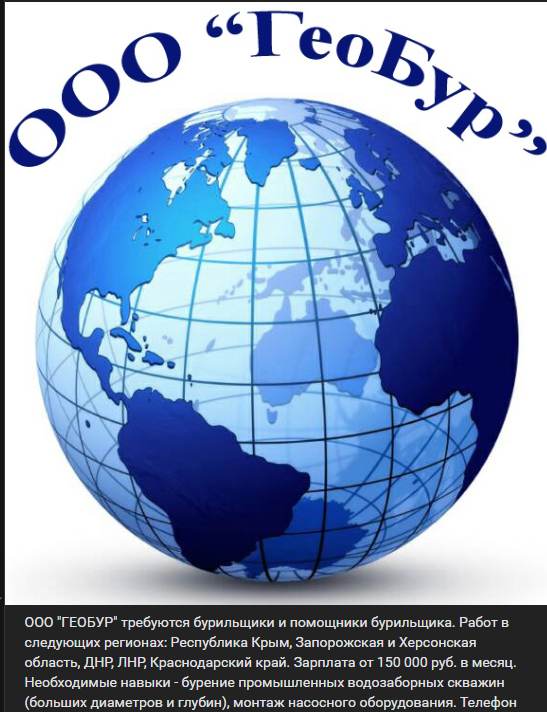 “Потрібні бурильники та помічники бурильника. Робот у наступних регіонах: Крим, Запорізька та Херсонська область, ДНР, ЛНР, Краснодарський край. У “ТОВ “ГЕОБУР” зарплатня від 150 000 рублів на місяць. Необхідні навички – буріння промислових водозабірних свердловин (великих діаметрів та глибин), монтаж насосного обладнання”, – йдеться у повідомленні.