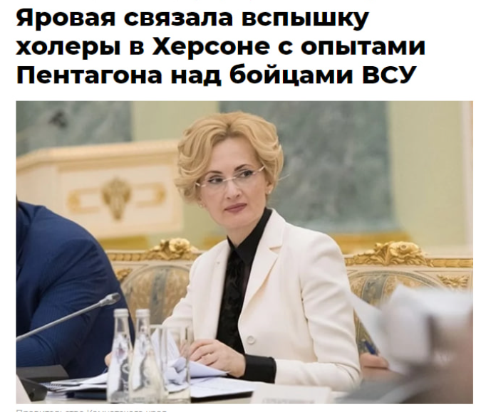 І звісно ж, як ви гадаєте, кого росіяни зробили винним в цьому уявному спалаху холери? Звісно ж, американців! Віцеспікерка Державної Думи РФ Іріна Яровая повідомила, що вигадана епідемія пов’язана з біологічними дослідами Пентагону над військовими та цивільними українцями. “Ні для кого не є секретом, що в Україні працюють американські біологічні лабораторії. Про це багаторазово повідомлялося.