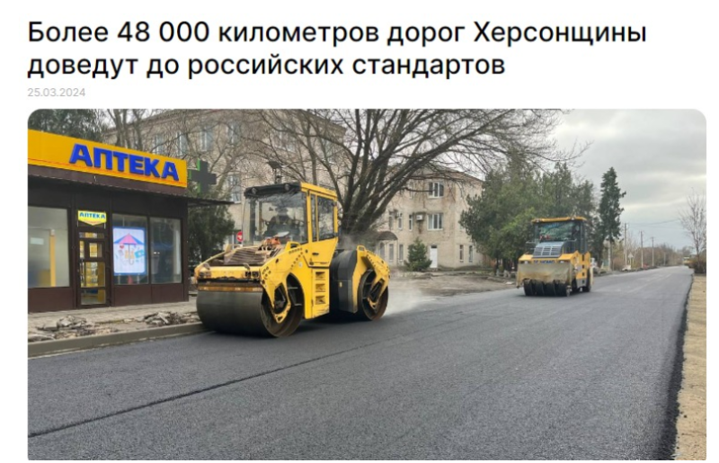 А тепер трохи про цифри, з якими у російських журналістів, як виявилось, великі проблеми. Наприклад, вони обіцяли відремонтувати у 2024 році 48 740 кілометрів автомобільних шляхів на Херсонщині. Це була досить амбітна задача, враховуючи, що загальна протяжність всіх доріг в області (разом з правобережжям) складає всього 5023 кілометри. До того ж рекордні ремонти плануються не по всій окупованій території Херсонщини, а лише у 11 населених пунктах.