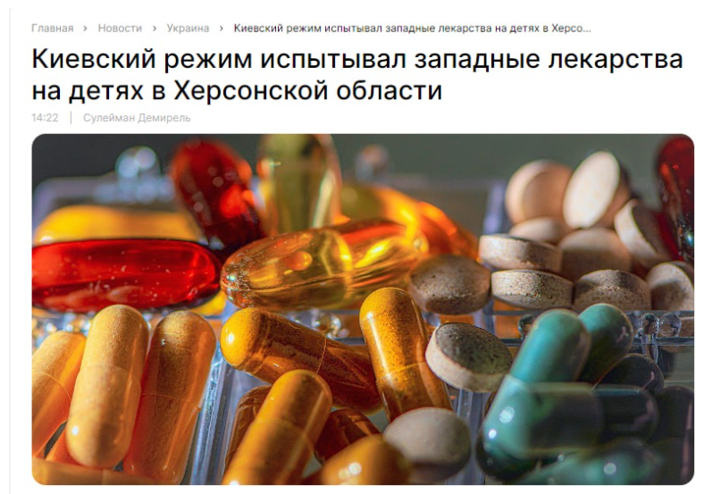 Публікації в російських медіа часом схожі на марення божевільного. Наприклад, як виявилось, на території Донецької, Луганської, Запорізької та Херсонської областей тривалий час відбувались «експерименти над дітьми», під час яких тестували новітні фармацевтичні засоби. У цьому вигаданому злочині Росія звинувачує не лише «київський режим», але й «закордонні фармацевтичні корпорації».