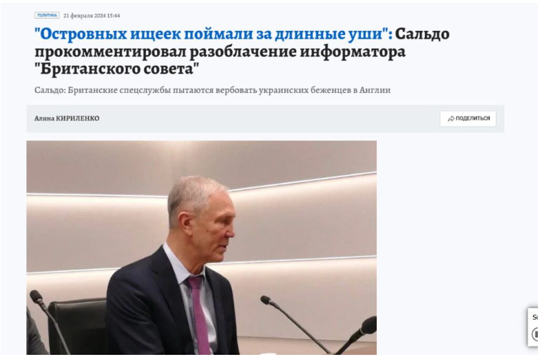 В лютому 2024 року, гауляйтер лівобережжя Херсонщини Володимир Сальдо, схоже, нарешті передивився серію бойовиків про Джеймса Бонда. Одразу після цього колаборант почав полювання на співробітників спецслужб Великобританії. За інформацією росіян, «агенти 007» шпигували за їхніми військовими на Херсонщині, а координувала це все таємнича організація “Британська рада”. Вони навіть упіймали одного «шпигуна» й виклали в Мережу відео з його свідченнями. На цьому відео чоловік зізнається, що його намагались завербувати через знайомих біженців, які зараз проживають на території Сполученого Королівства.