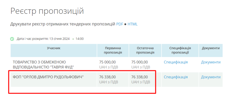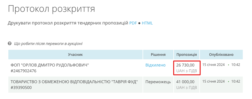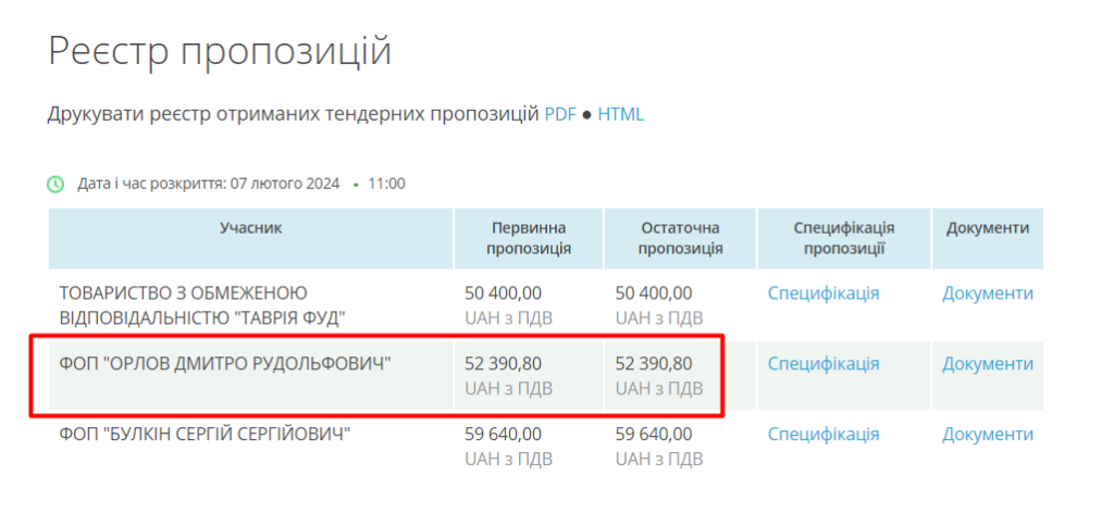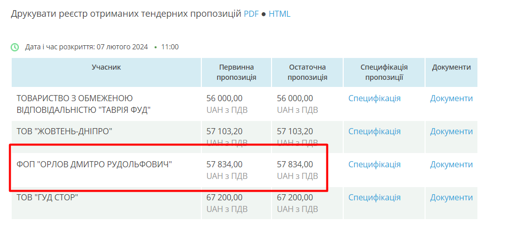 До речі, цей самий учасник, ФОП Орлов Дмитро Рудольфович, і далі брав участь у торгах, але вже пропонував ціни, вищі за ціну «Таврія Фуд».