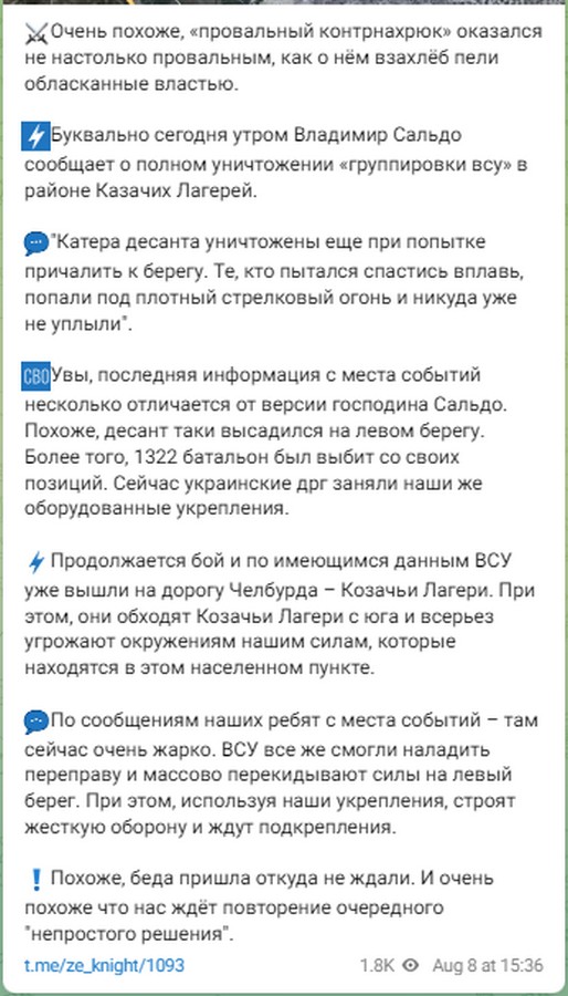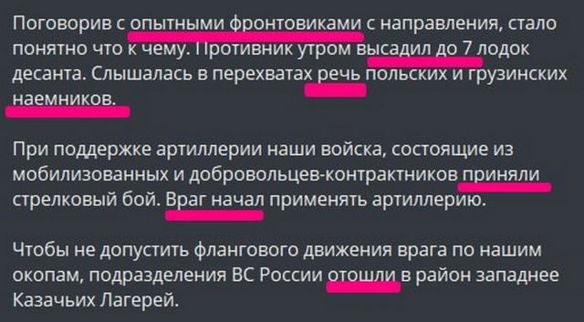 За їхньою інформацією, в районі села Козачі Лагері висадилося «угрупування ЗСУ», яке вибило з обладнаних позицій російський 1322 батальйон.