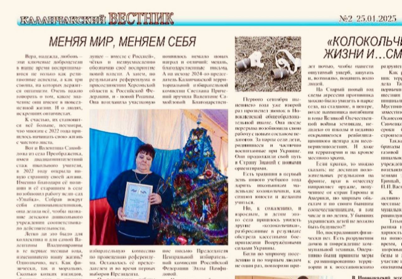 Колаборантка Валентина Самойлова з Преображенки Каланчацького району прізвища вирішила не приховувати, бо після всього, що зробила для окупантів, їй все одно не уникнути відповідальності. Зрадниця, «маючи двадцятип’ятирічний стаж роботи шкільного вчителя, у 2022 році відкрила нову сторінку свого життя, – написав окупаційний «Каланчакский вестник». – Саме завдяки її позиції і старанням у селі відновив роботу ясла-садок «Посмішка». Але сама при цьому, мабуть, не посміхалась, бо, як пишуть пропагандисти, їй було зовсім нелегко: «Як фізично, так і морально. Скільки косих поглядів, образливих слів і прямих погроз довелось відчути і пережити». Але істоту, яка вирішила поміняти батьківщину і співгромадян на багато рублів, те не зупинило.