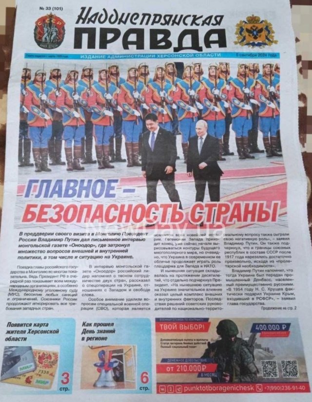 Окупаційна «Надднепрянская правда» також починає брехати вже з першої шпальти, де про візит кремлівського пенсіонера до Монголії сказано, що «Президент РФ вчергове показує всім міжнародним організаціям, а особливо Міжнародному кримінальному суду, безсилля будь-яких санкцій і обмежень». Спробував би він з’їздити в іншу країну, яка визнає юрисдикцію МКС і, водночас, не є аж надто залежною від російських енергоресурсів! Вже з другої шпальти брехуни нахабнішають настільки, що починають вигадувати на ходу. Далі - цитати.«Військовослужбовці української армії залишили напризволяще цілий підрозділ при втечі з села у Курській області». «ЗСУ виготовляють у лабораторії під Краматорськом боєприпаси з хлорпікрином на БПГІА. Хімзброю планується застосувати на артемівській ділянці фронту, у тому числі біля Часового Яру у Донецькій Народній Республіці». «Верховна Рада прийняла у кінцевому читанні законопроект, який забороняє у країні діяльність канонічної Української православної церкви... Без американців тут ніяк».