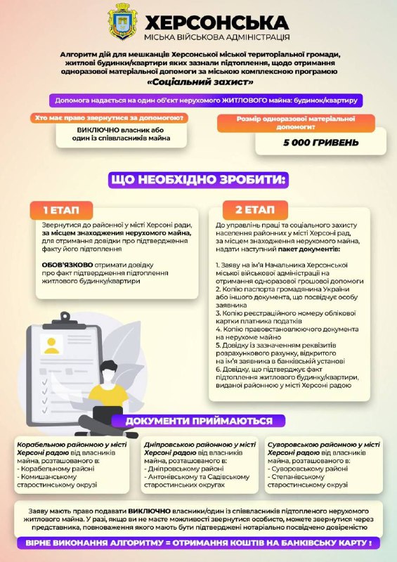 17 червня влада оприлюднила алгоритм дій для отримання одноразової допомоги в 5 тисяч гривень від Херсонської міської військової адміністрації херсонцями, чиє житло постраждало внаслідок підриву росіянами дамби Каховської ГЕС.Ось що зазначено в алгоритмі:Хто має право звернутися за допомогою?Виключно власник або один із співвласників майна.Що необхідно зробити?І етап: Звернутися до районної ради в Херсоні за місцем знаходження нерухомого майна для отримання довідки про підтвердження факту його підтоплення.