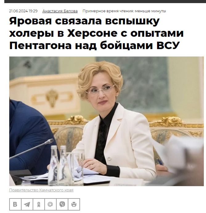 І звісно ж, як ви гадаєте, кого росіяни зробили винним в цьому уявному спалаху холери? Звісно ж, американці! Віцеспікерка Державної Думи РФ Іріна Яровая повідомила, що уявна епідемія пов’язана з біологічними дослідами Пентагону над військовими та цивільними українцями. “Ні для кого не є секретом, що в Україні працюють американські біологічні лабораторії. Про це багаторазово повідомлялося.Тому мене особисто не дивує конспірологічна версія про те, що американці зі своєї лабораторії підкинули генетично модифіковану холеру у воду, щоб отруїти російських солдатів, але помилилися адресою і отруїли не тих, кого планували”, – пише одне з російських видань.