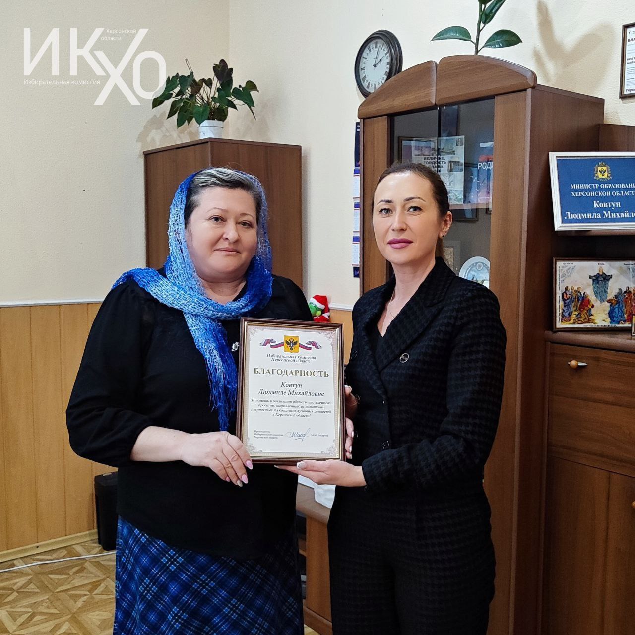 «Міністерство освіти бере активну участь у реалізації заходів, що проводяться для підвищення рівня правової обізнаності і культури серед школярів і студентів, – повідомила у соцмережі голова окупаційної виборчої комісії області Марина Захарова. – При підтримці міносвіти були організовані різноманітні акції, ігри, тренінги і семінари, які допомогли нашим майбутнім виборцям дізнатись про свої права і зрозуміти, у чому полягає важливість участі у виборах». За це окупаційна міністерка освіти Людмила Ковтун навіть отримала від Марини Захарової лист подяки.