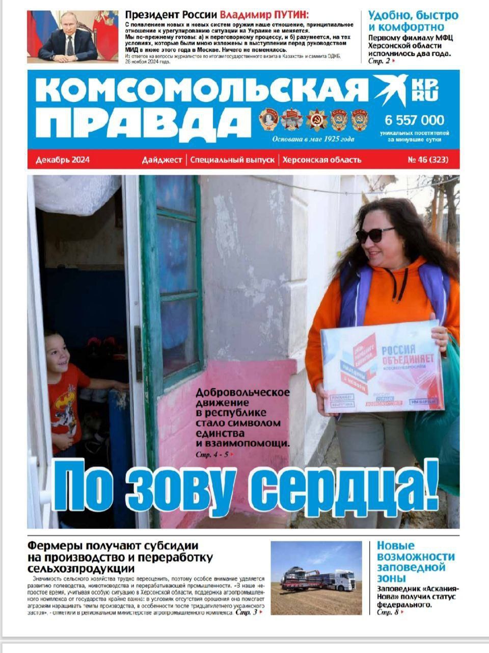 Погортати, покопатися там. У цьому є кайф якийсь, правда?»Правда – лише у тому випадку, коли мова йде дійсно про журналістику. А стосовно «Комсомолки», Путіну її і гортати не треба – його недолугі висловлювання завжди розміщують на першій шпальті з самого верху. Принаймні у спецвипусках для окупованої частини Херсонської області. В одному з останніх номерів, наприклад, вміщено його брехливу тезу про, буцімто, готовність до переговорів, але на його умовах. Тезу звичайного рекетира з 90-х: віддайте мені те, що мені не належить. Хоча, в принципі, Росія наразі у 90-х і живе.