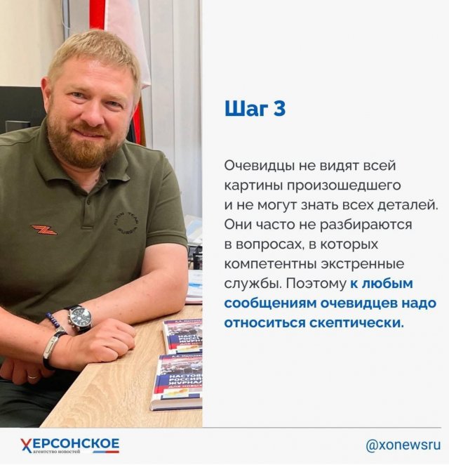 Першим кроком пропагандист радить перевіряти джерело, бо «є і ті, хто видає себе за журналістів, навмисно розповсюджуючи брехню» (наприклад, він). Другим брехун радить запам’ятати, що «найнадійніше джерело інформації - це офіційне повідомлення». Тобто треба вірити байкам Конашенкова про купи знищеної НАТОвської військової техніки і особового складу «націоналістів»? На третьому кроці Малькєвіч закликає не вірити... очевидцям. Пише: «Очевидці не бачать всієї картини того, що сталось, і не можуть знати всіх деталей. Вони часто не розбираються у питаннях, в яких компетентні екстрені служби. Тому до будь-яких повідомлень очевидців треба ставитись скептично». На цьому і зупинимось. І відразу ж застосуємо «третій крок» «експерта».