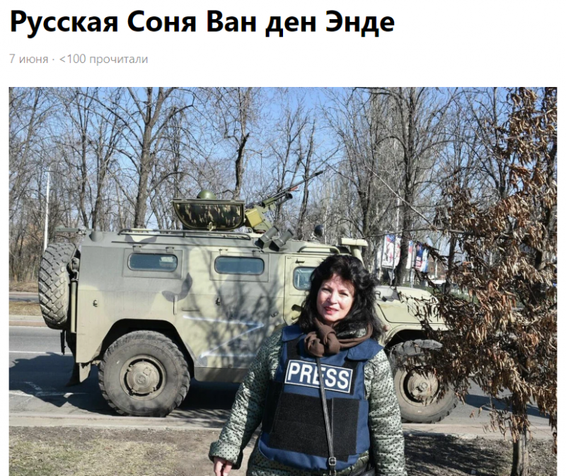 Великі сумніви виникають і щодо об’єктивності нідерландки Соні Ван ден Енде, яку окупанти відкрито називають “своєю” та “росіянкою”. Пані Ван ден Енде приїхала на окуповані Росією території України ще на початку 2022 року і брала активну участь у “прес-турах” для іноземних журналістів, зокрема, до зруйнованого росіянами Маріуполя.