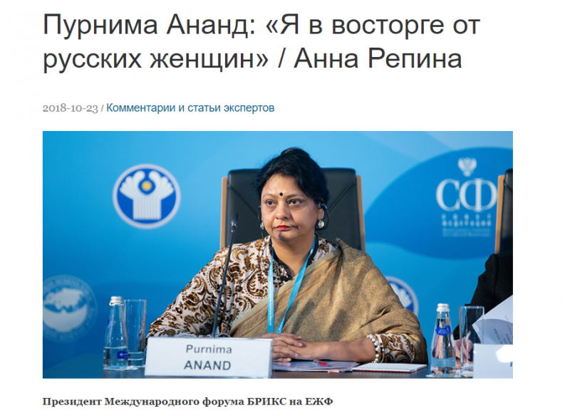 Паралельно займаючи посаду “Президента міжнародного форуму БРІКС”, що веде громадську діяльність, Пурніма Ананд чи не у кожному своєму інтерв’ю розповідає про захоплення росіянами, їхньою культурою і традиціями, а також важливою роллю Росії у сучасній світобудові. Звичайно, Ананд також відвідувала території окупованої Донецької і Луганської областей під час проведення там так званих “референдумів”. Тоді, як і зараз, вона ніяких порушень під час голосування не виявила і закликала визнати його результати.