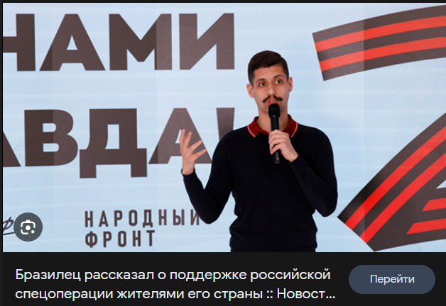 Громадянин Бразилії Енріке Домінгес став ще одним “міжнародним спостерігачем” на незаконних виборах. Все, що треба знати про цього персонажа, – він є переможцем конкурсу російської газети “ВЗГЛЯД” для іноземних журналістів, які підтримують російську агресію проти України. За це від отримав футболку з літерою “Z” та річну підписку на російські Інтернет-ресурси. Домінгес живе в Росії та навчається в одному з Петербурзьких ВИШів, однак це не заважає йому розповідати про тотальну любов бразильців до Путіна. Ось лише одна цитата з його інтерв’ю російським журналістам: