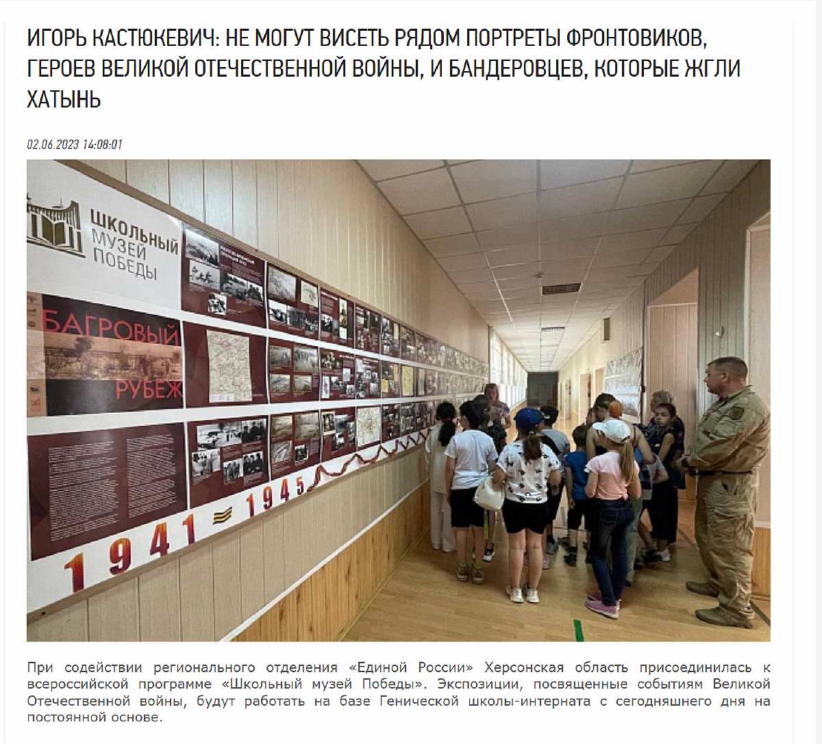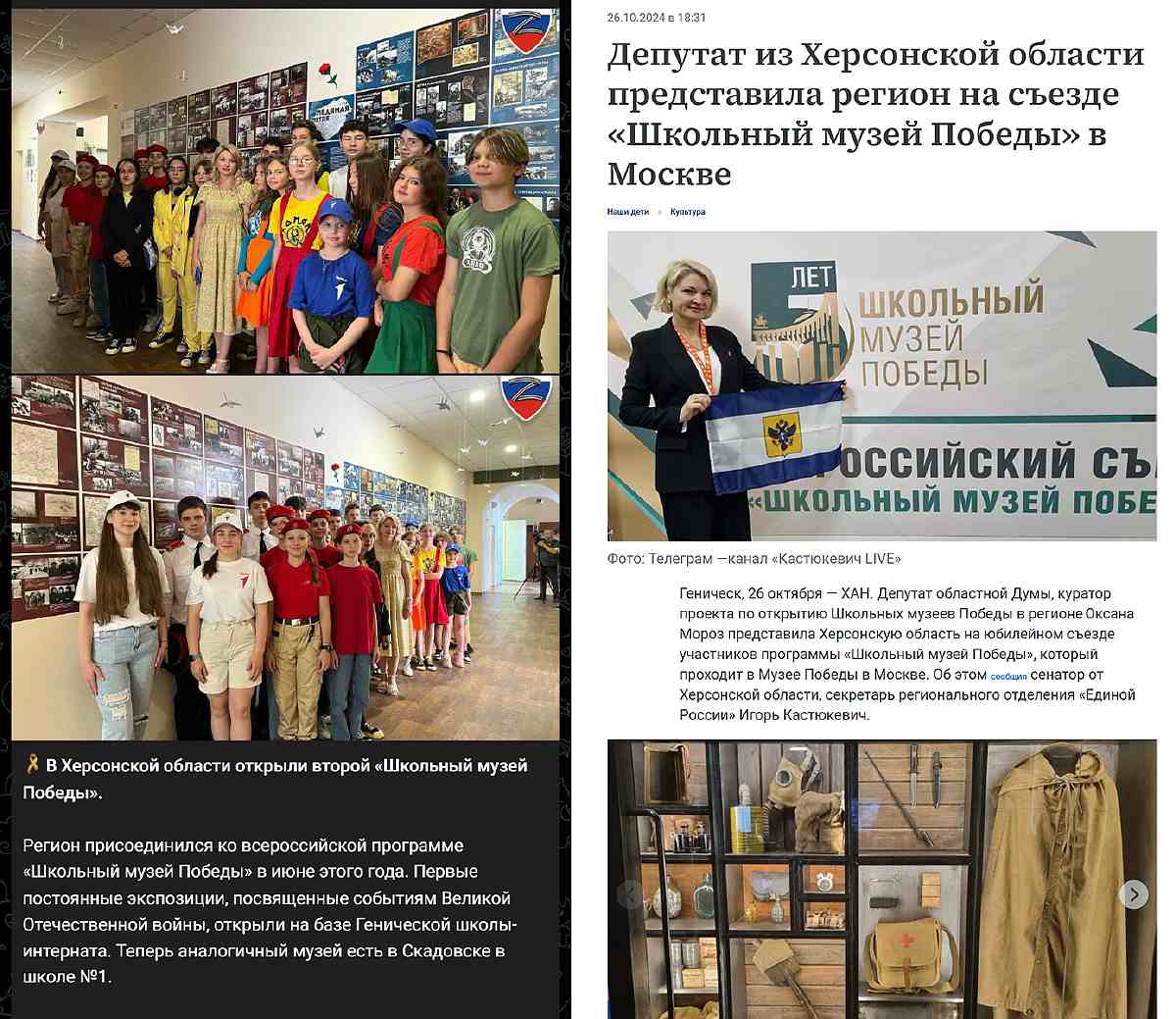 Російська влада з літа 2023 року активно відкриває на окупованих територіях Херсонщини «шкільні музеї побєди», заявляючи про мету навчити дітей «справжньому російському патріотизму». Програма реалізується за підтримки партії «Єдина Росія». Однак темою минулої війни, яка є наріжним каменем ідеології Росії та міф про яку використовується для виправдання нинішньої війни Росії проти України, у таких шкільних музеях не обмежуються, згадуючи й «героїв СВО».