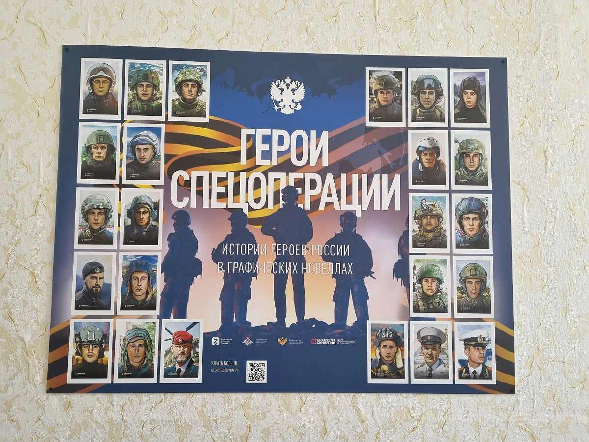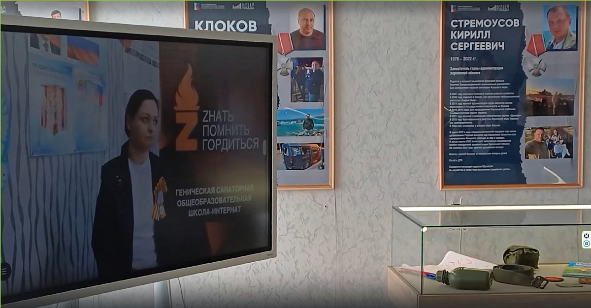 Фрагмент експозиції, присвяченій «героям СВО», в Генічеській школі-інтернаті. Стоп-кадр з відео окупаційних ресурсів«У виставковому просторі представлені експонати, подаровані учням військовими: особисті речі учасників СВО, елементи військового обмундирування, шеврони. Крім того, серед експонатів – прапор Росії з побажаннями від військовослужбовців та малюнки учнів школи-інтернату, присвячені захисникам Батьківщини. Важливе місце в експозиції займає інформація про загиблих у зоні проведення спеціальної військової операції заступника голови адміністрації Херсонської області Кирила Стремоусова, журналіста Олега Клокова, громадського та політичного діяча Олексія Журавка», – так описується експозиція на сайті Музею побєди.