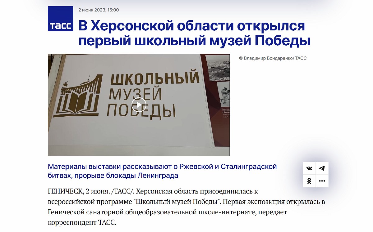 Скріншот повідомлення ТАССЯкщо зазвичай шкільні музеї базуються на краєзнавчому матеріалі, то пропагандистів місцеві події цікавлять далеко не в першу чергу – експозиція присвячена відомим подіям «Великої Вітчизняної війни» та базується на матеріалах Музею побєди у Москві. Правда, на відкритті пообіцяли згодом доповнити матеріалами про воєнну історію Генічеська та Херсонщини й заявляли, що в одному з пізніше відкритих музеїв місцеву інформацію додали.