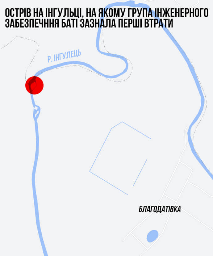 Слово-біль героїв цього тексту – острів. Крихітний клаптик суші посеред Інгульця, що розташований неподалік села Благодатівка й навіть не має свого імені на карті, став місцем перших втрат підрозділу.