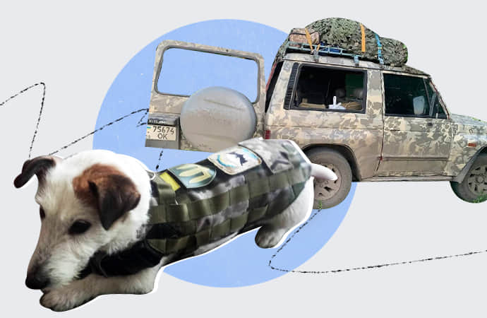 "Я пішов дивитися на нашу машину, а в ній не було жодного скла! Зате вціліли колеса. А ще в машині була моя собака Арсі, я взяв її з собою на війну, бо не було з ким удома лишити. Так от Арсі була жива! Контужена, перелякана, але жива! Так ми і виїхали тією машиною", – пригадує Фін.