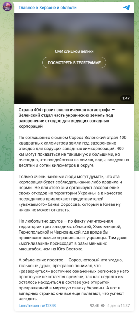 Telegram-канал «Главное в Херсоне», який розповсюджує російську пропаганду, опублікував новину про нібито передачу в трьох областях України землі загальною площиною 400 квадратних кілометрів в концесійне користування шести іноземним компаніям для захоронення на цій землі токсичних відходів хімічної та фармацевтичної промисловості.Що кажуть окупантиПроросійський Telegram-канал «Главное в Херсоне», який позиціонує себе як херсонське медіа, має лояльну до російських окупантів редакційну політику і розміщує повідомлення про події на тимчасово підконтрольній росіянам лівобережній частині Херсонської області, опублікував повідомлення про нібито загрозу екологічної катастрофи в Україні, яку спричинить захоронення на території країни токсичних відходів хімічної і фармацевтичної промисловості.