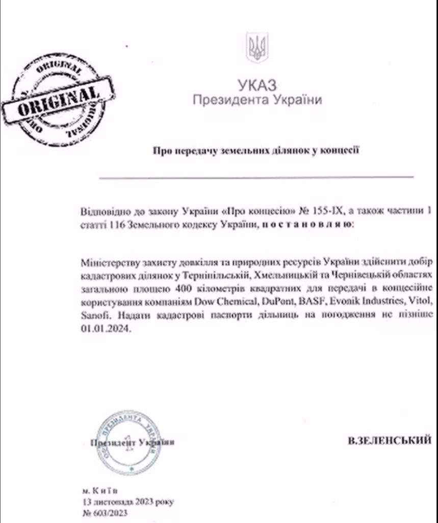 “Указ Президента України”, яким ілюструють повідомлення про передачу землі.Посередником в цій угоді нібито виступив керівник Open Society Foundations Алекс Сорос, який відвідав Україну 7 листопада 2023 року.