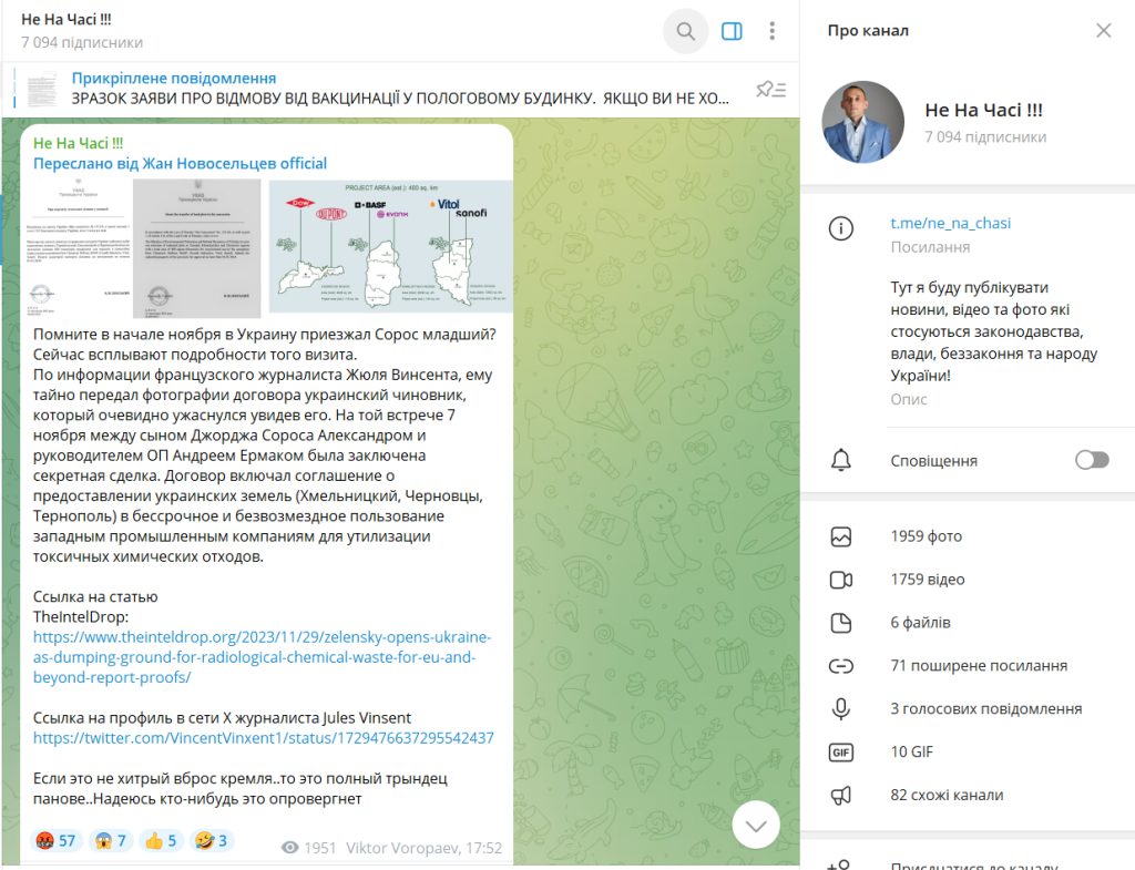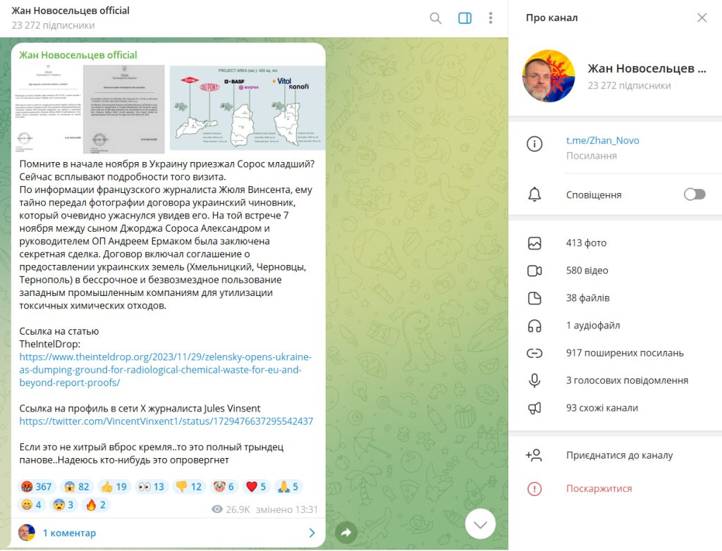 Повідомлення про нібито передачу західним компаніям української землі можна знайти і в деяких українських джерелах. Наприклад, його розмістили Telegram-канал «Не на часі», TikTok-акаунт «telegrammnenachasi» і український телеведучий Жан Новосельцев – в своєму Telegram-каналі.