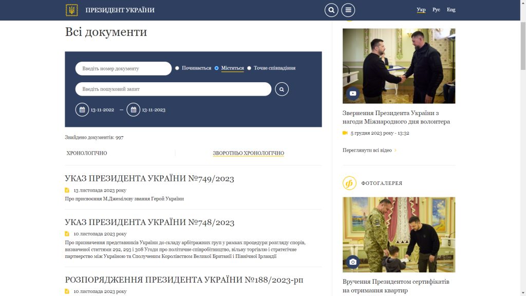 На сайті Президента України можна побачити, що укази з номерами від 600 до 700 видавалися у вересні-жовтні 2023 року. А реально виданий указ від 13 листопада про присвоєння Мустафі Джемілєву звання «Герой України» має номер 749.