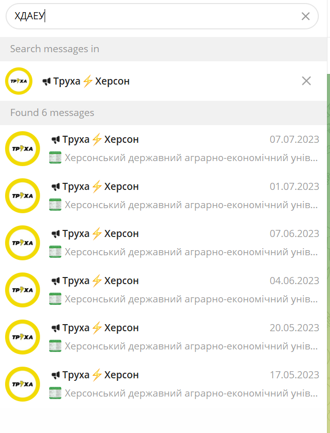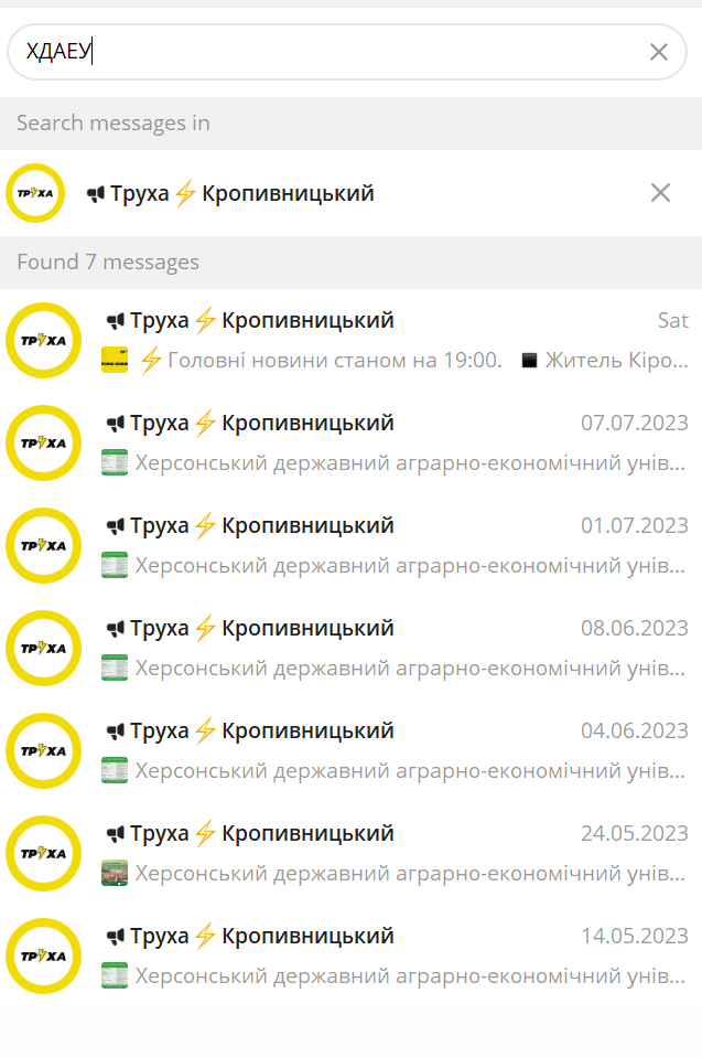 При цьому, в обидвох «Трухах» всі повідомлення щодо херсонського аграрного університету — 2023 року (для пошуку спробували різні запити). І лише «Труха Кропивницький» розмістила 4 травня 2024-го у дайджесті посилання про день відкритих дверей у ХДАЕУ із посиланням на видання «Український Південь».