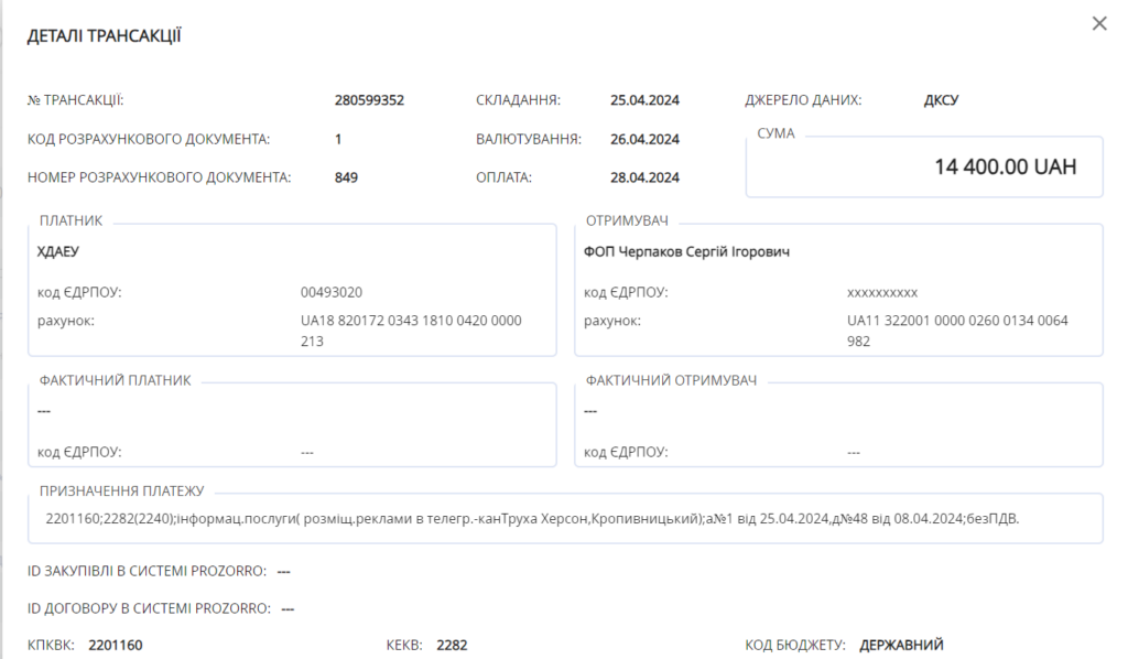 За сумою у 14 400 гривень виходить, що Херсонський державний аграрно-економічний університет оплатив, скоріш за все, два розміщення у телеграм-каналі «Труха Кропивницький» (8 400 грн) та два — в «Труха Херсон» (6 000 грн). Але нагадаємо: жодних свіжих публікацій там немає.Оплата за рекламу в каналі, як видно зі скріншоту транзакції вище, здійснювалась на ФОП Черпаков Сергій Ігорович. Це підприємець з міста Дніпро, який працює зокрема у сфері реклами.