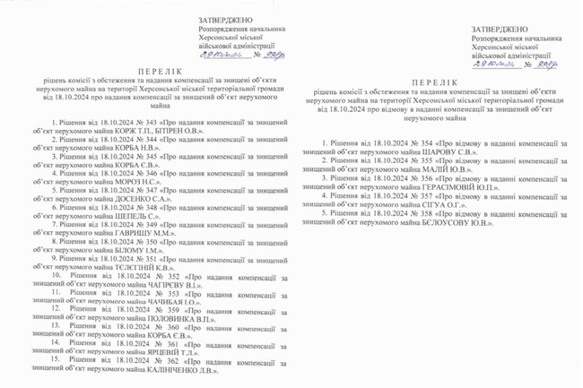 У документі пояснюється, що компенсації розглядатимуться відповідно до переліку об'єктів, включених у Державний реєстр пошкодженого майна.Наголошується, що для уникнення маніпуляцій та забезпечення прозорості процесу всі рішення комісій буде оприлюднено на офіційному сайті Херсонської міської ради.