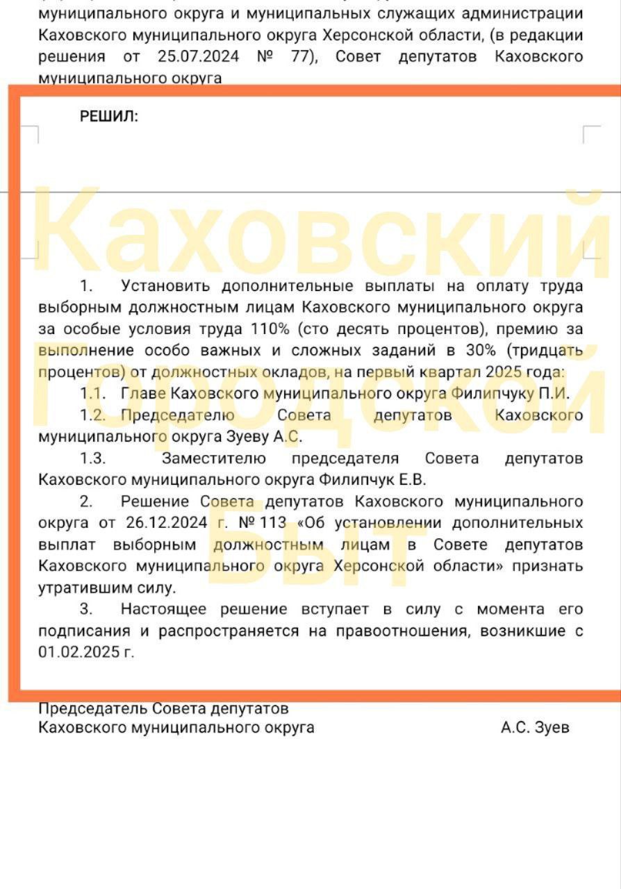 Наприклад, 20 лютого на так званій сесії окупаційної ради депутатів Каховського «муніципального округу» колаборанти знову проголосували за «додаткові виплати на оплату праці виборним посадовим особам Каховського муніципального округу за особливі умови праці 110 %, премію за виконання особливо важливих і важких завдань у 30 % від посадових окладів на перший квартал 2025 року». Таких посадових осіб виявилось всього троє: «голова округу» Павло Філіпчук, його матір Олена, заступниця «голови ради депутатів», і Олександр Зуєв, «голова ради».