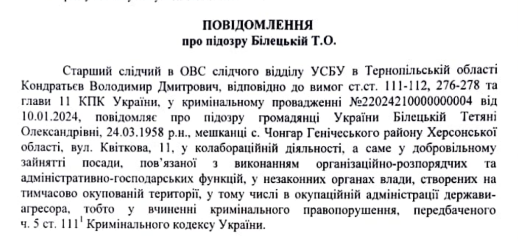 5 вересня Служба безпеки України повідомила про підозру мешканці села Чонгар на тимчасово окупованій Херсонщині Тетяні Білецькій. Жінку підозрюють у колабораційній діяльності.Про це повідомляється на сайті Офісу Генерального прокурора.За даними слідчих, Білецька добровільно зайняла посаду, яка пов’язана з виконанням організаційно-розпорядчих та адміністративно-господарських функцій у незаконно створеному органі влади.