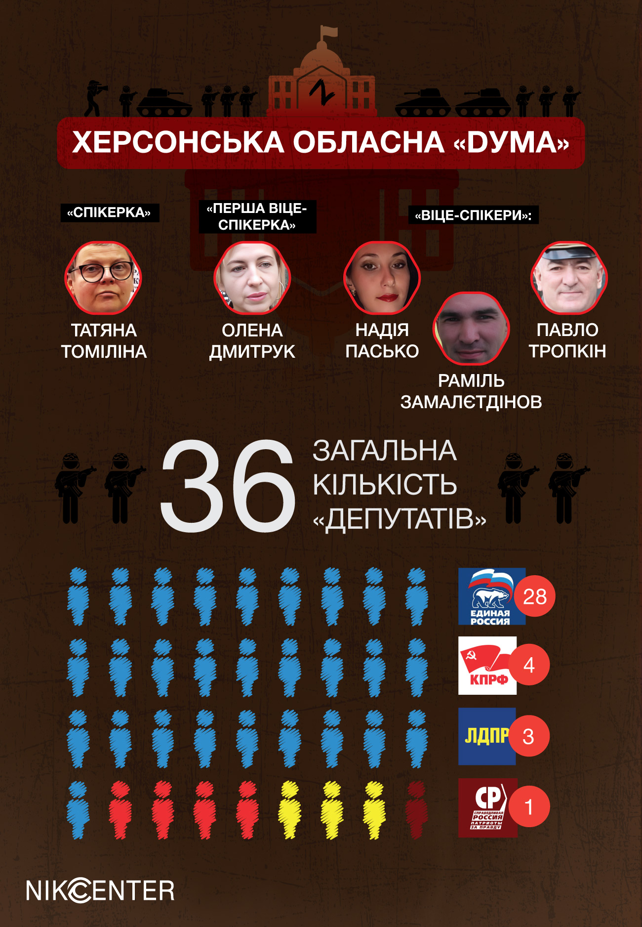 До підконтрольної російським окупантам Херсонської «обласної думи» входять 36 депутатів, з яких 28 — представляють партію «Єдина Росія», чотири – КПРФ, три – ЛДПР і один – партію «Справедлива Росія – Патріоти – За правду».Тобто, «Єдина Росія» отримала в окупаційному «парламенті» Херсонщини не просто «контрольний пакет», а безперечне домінування. Решта – 8 депутатів – із 36, які є представниками інших партій, не здатні вплинути не те що на результати голосувань, а й на кворум.