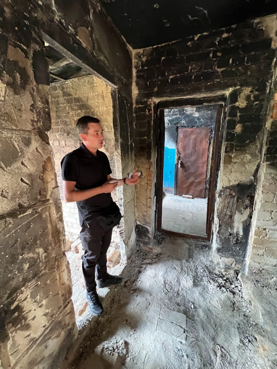 Костянтин Стародумов в одному з пошкоджених війною будинків. Фото: Олег Батурин/ЦЖР
