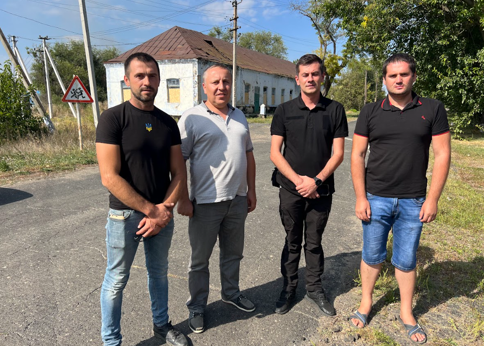 Олександр Тетеря, староста села Іванівка, Ігор Миклащук, голова Уманської районної військової адміністрації, Костянтин Стародумов і Руслан Залізко, директор компанії-підрядника з Черкащини в селі Іванівка. Фото: Олег Батурин/ЦЖР