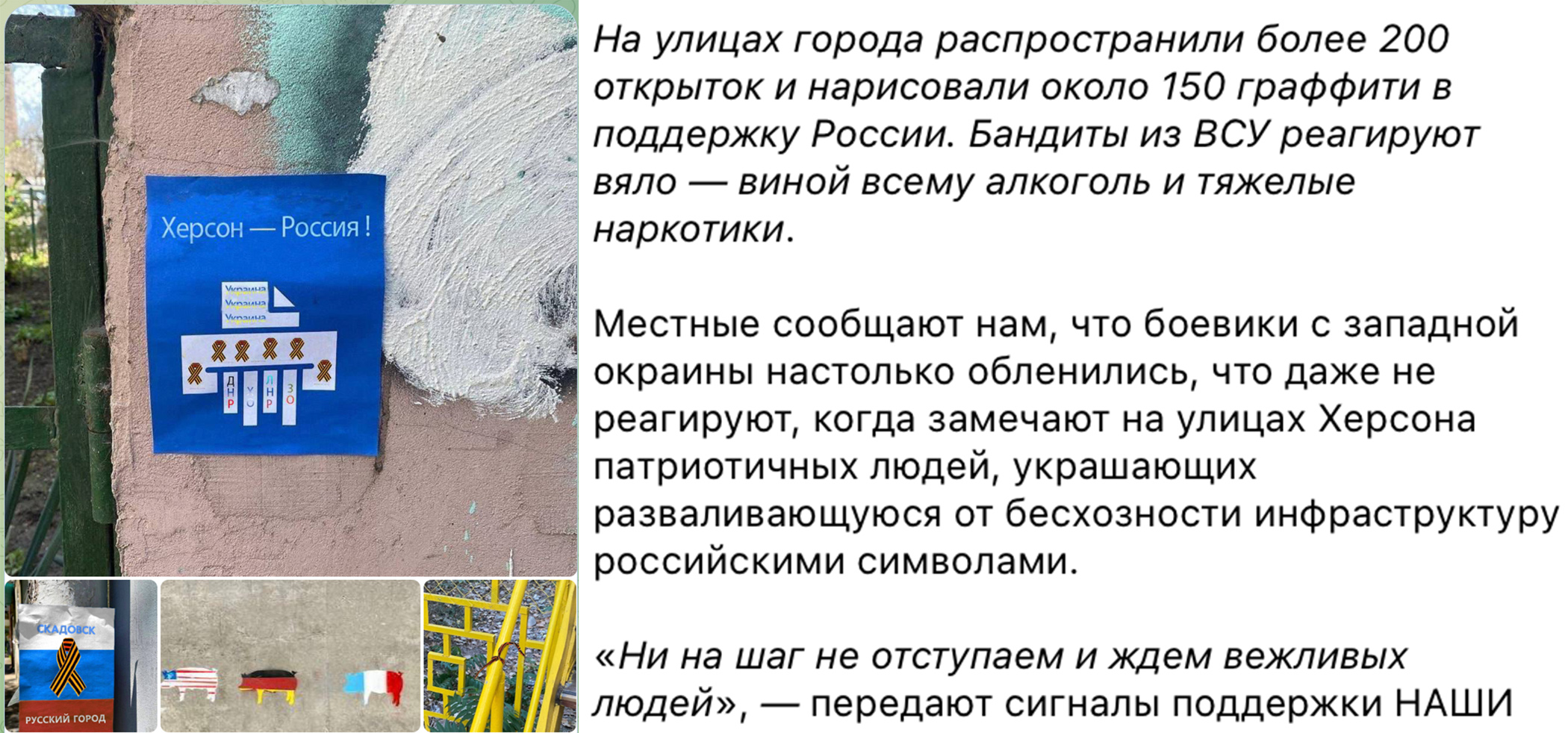 Подібні повідомлення, які нібито свідчать про існування проросійських груп у деокупованому Херсоні, пропагандисти розповсюджують для тиску на жителів лівого берега. Адже хочуть вселити віру у те, що нібито окупантів чекають у Херсоні. Вони подають ці фото як свідчення “сигналів від наших людей”, які насправді є фейком.