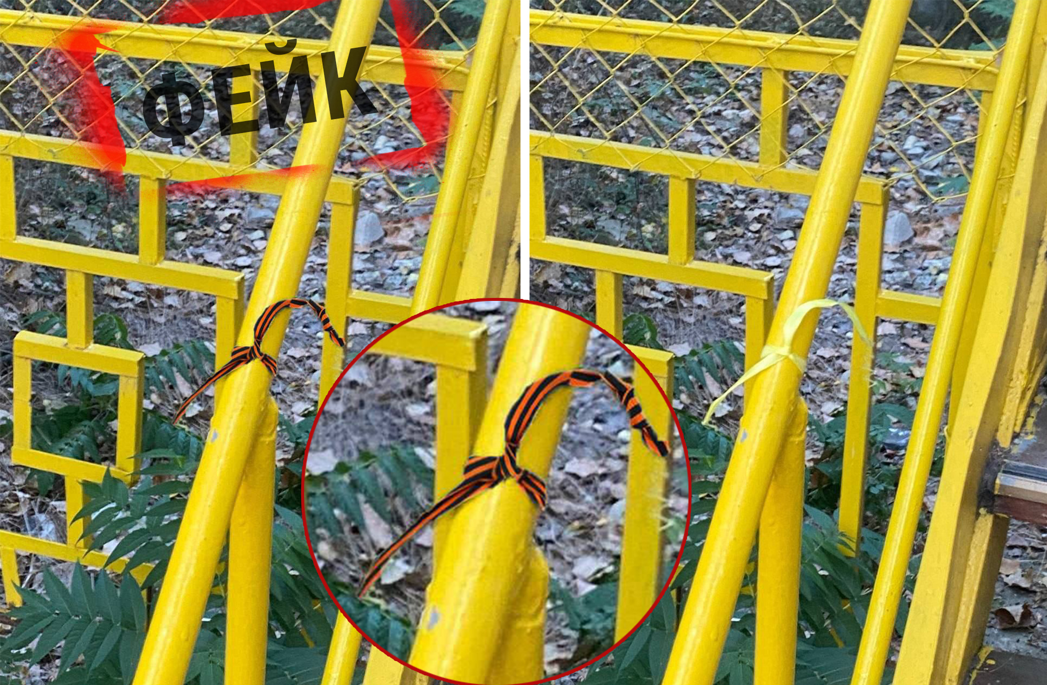 Те саме окупанти провернули з жовтою стрічкою, перефарбувавши її в колір георгіївської стрічки. Зміни на фото можна побачити й неозброєним оком. Також видно й жовті нитки від стрічки.