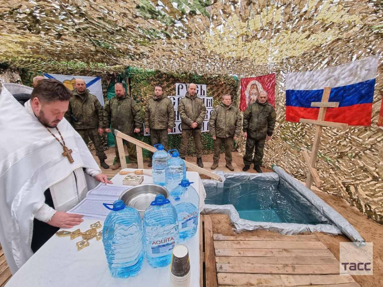 Окупанти з угрупування «Днєпр» купались, як написали пропагандисти, «біля однієї з каплиць регіону». Де саме, на відео визначити неможливо. «Дуже радісно, що можна цю традицію привезти, зустріти це свято тут разом з бійцями, щоб вони хоч трішки відволіклись від своїх ратних справ», – розповів пропагандистам такий собі ієрей Станіслав – «помічник командира з роботи з віруючими військовослужбовцями». Звісно, благословляв він їх на вбивство невинних людей.
