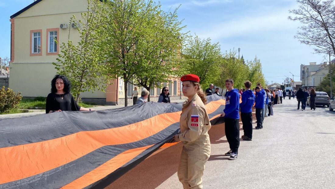 “До Дня Перемоги на Херсонщині стартувала особлива акція — естафета передачі 84-метрової Георгіївської стрічки. Такий масштабний проєкт ми проводимо вперше. Старт дано у Генічеську на площі перед кінотеатром «Росія». Більше сотні людей — волонтери «Єдиної Росії», «Волонтери Перемоги», юнармійці, громадські діячі — розгорнули 84-метрове полотнище (на честь нашого автомобільного коду) та передали його до Новотроїцького округу”.