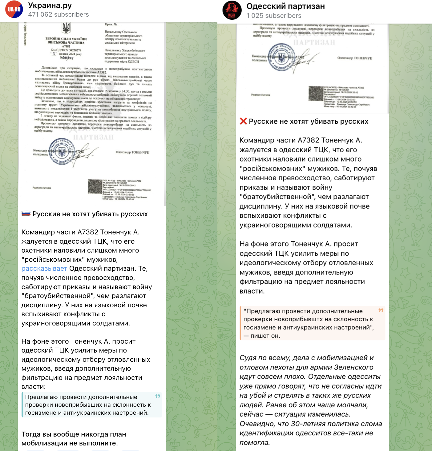 Російські телеграм-канали поширили інформацію, що нібито в Одеській 126-ій бригаді тероборони, яка виконує завдання й на Херсонському напрямку, виникають конфлікти на мовному ґрунті. Чи дійсно це так – читайте в матеріалі.Що сталося?Телеграм-канали “Одеський партизан” та “Украина.ру”, які систематично розповсюджують російську пропаганду, поширили нібито доповідь командира військової частини А7382 (Одеська 126-та бригада тероборони) Олександра Тоненчука.