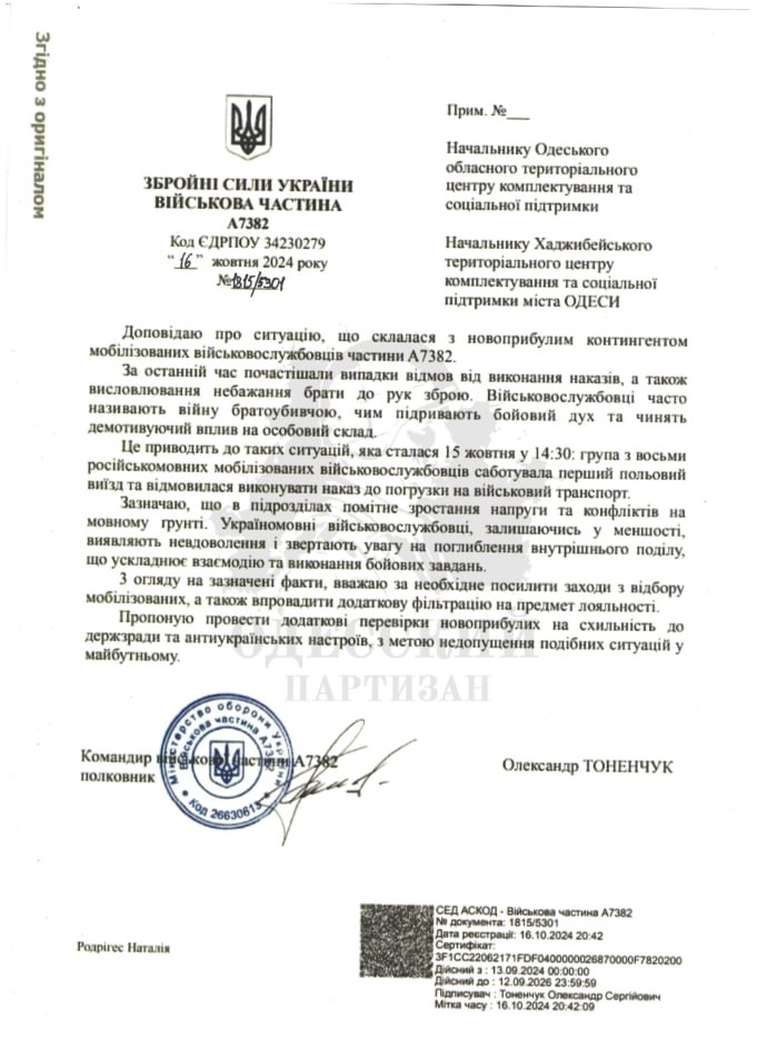 Аби розв'язати проблему, командир буцімто пропонує одеському ТЦК провести додаткові перевірки новоприбулих на схильність до держзради та антиукраїнських настроїв.