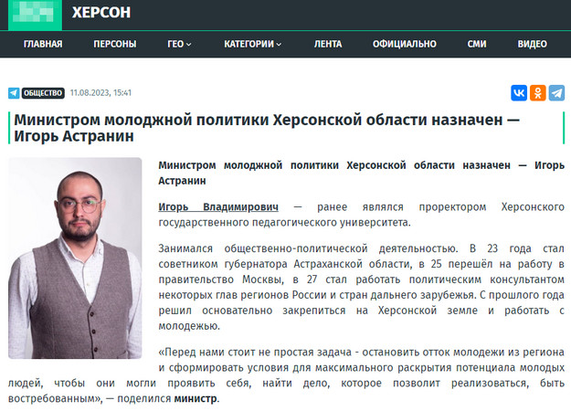 Гауляйтер Херсонської області Володимир Сальдо створив “міністерство молодіжної політики” та призначив його очільником політичного провокатора з досвідом.Звати його Ігор Астранін. Він походить з російського міста Астрахань.Там Астранін був керівником відділення прокремлівського молодіжного руху “Наші”.Рух “Наші” був заснований у 2005 році.Відбувалось це під патронажем тодішніх керівника Росмолоді Василя Якеменка та заступника голови Адміністрації президента РФ Владислава Суркова.